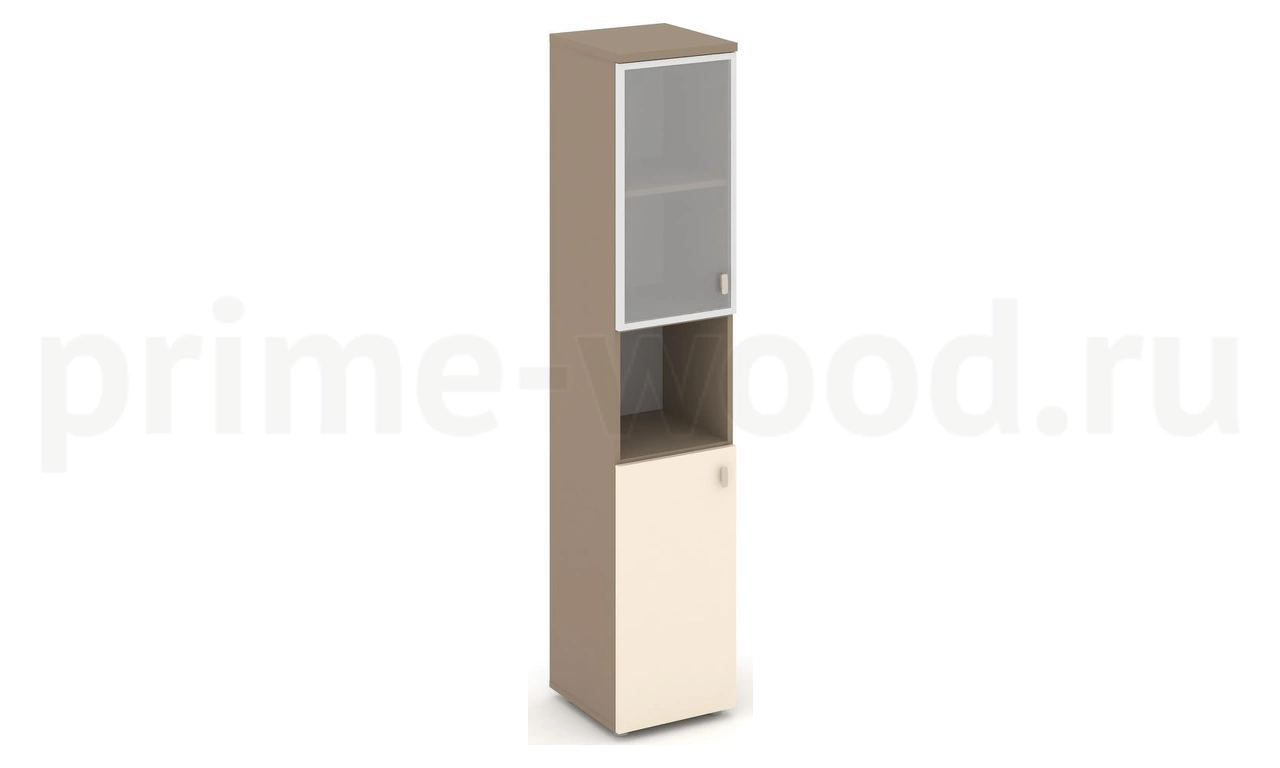 Шкаф высокий узкий левый (1 низкий фасад ЛДСП + 1 низкий фасад стекло в раме сатин матовый)
