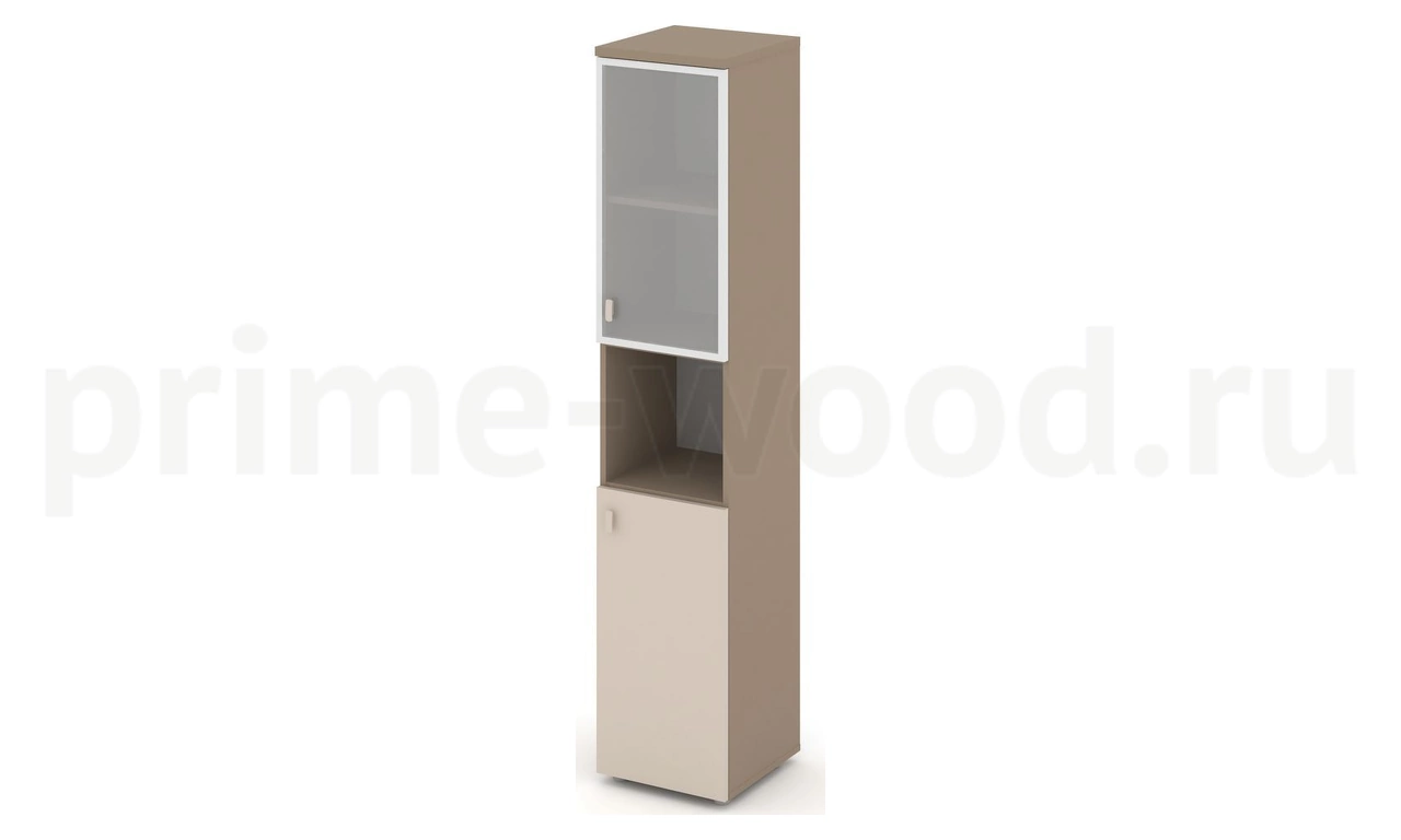 Шкаф высокий узкий правый (1 низкий фасад ЛДСП + 1 низкий фасад стекло в раме сатин матовый)